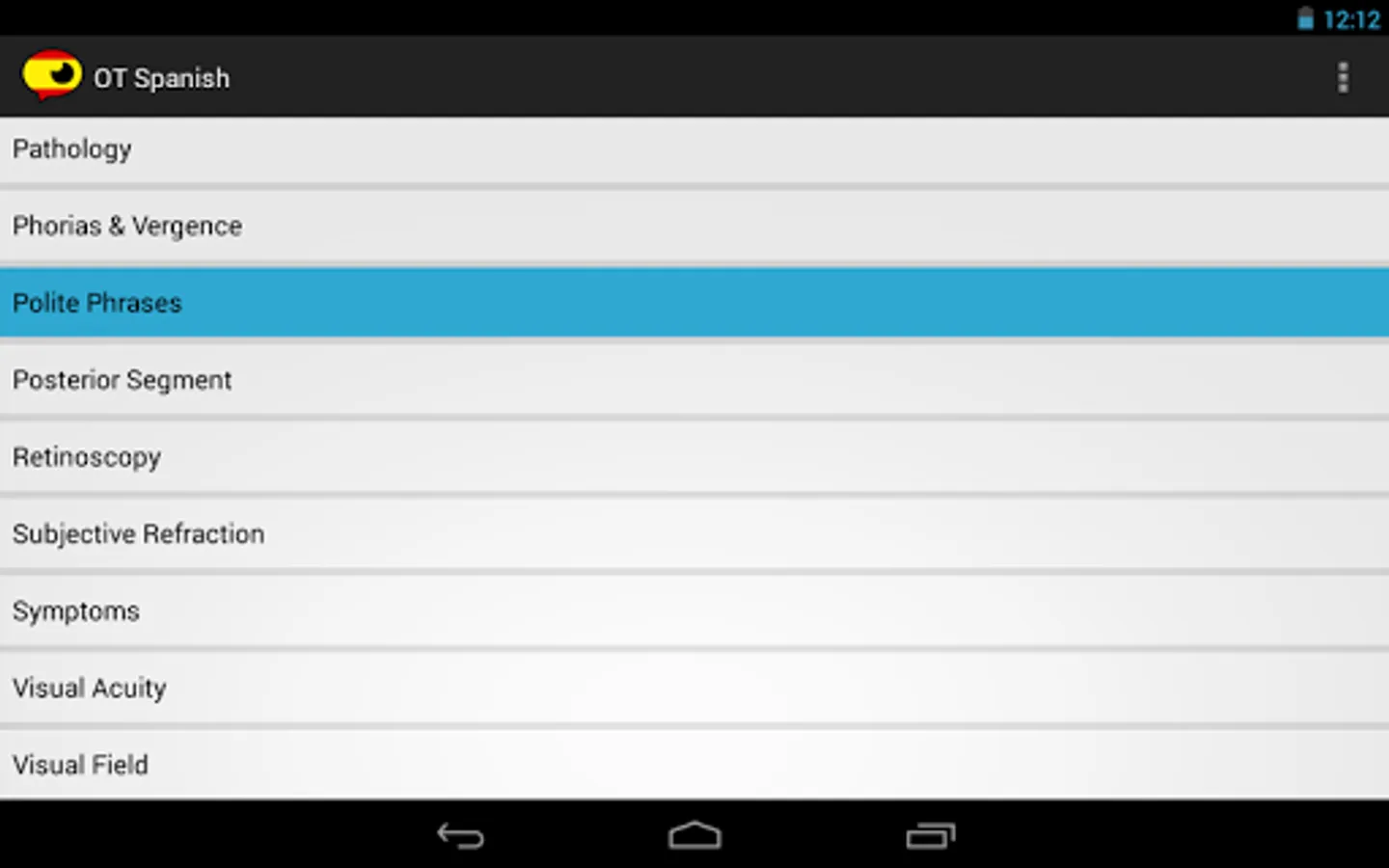 In addition to being an essential tool during an exam, doctors now have an easy quick reference guide to practice and pronounce the most useful phrases. This app enables doctors to learn enough Spanish to complete a full eye exam. Most language courses do not teach technical medical terminology, so why waste your time? Just learn what you need to know!