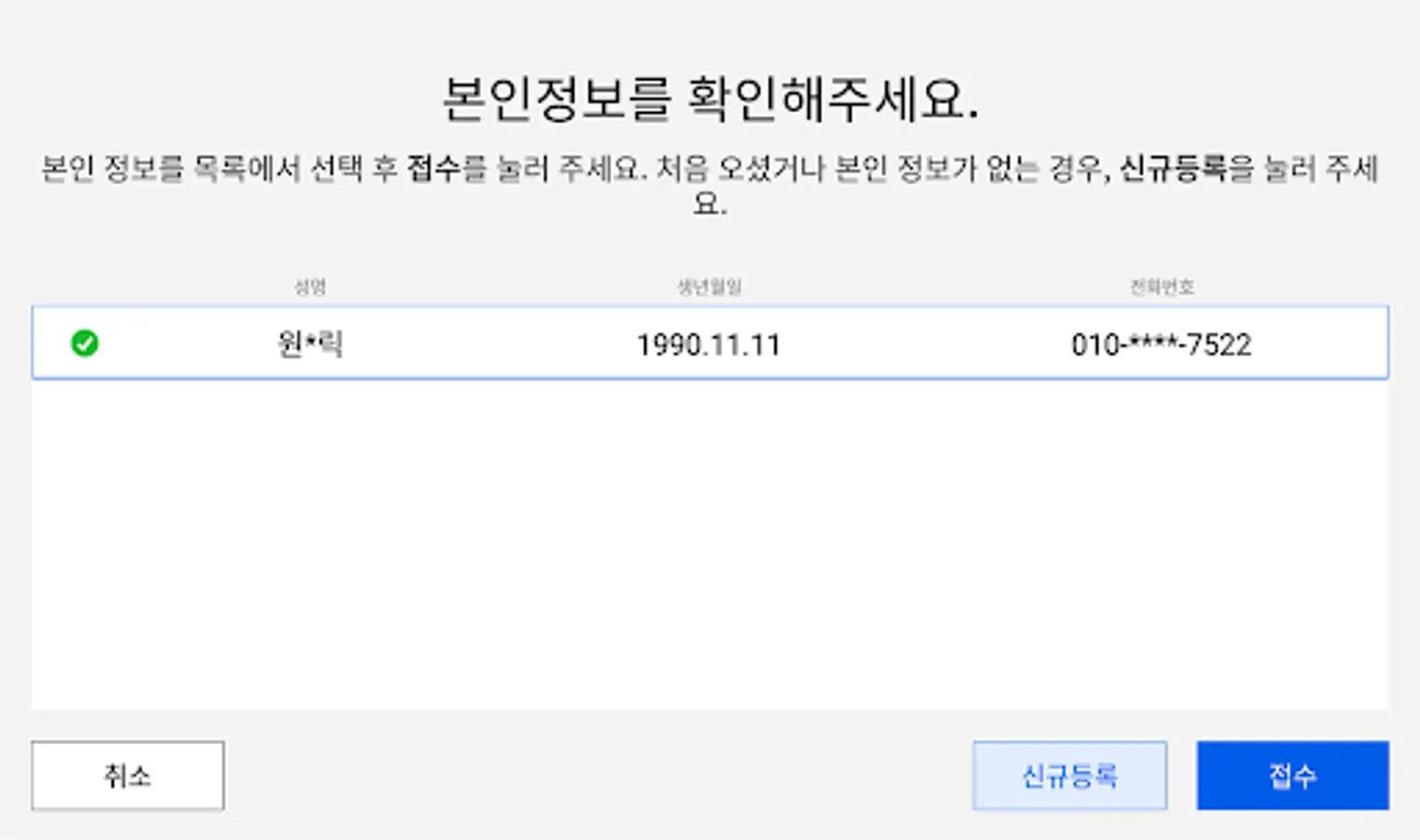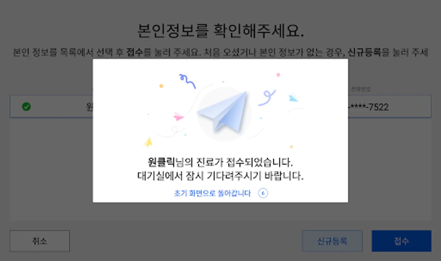 - 환자 이름을 검색한 후, 진료 접수를 진행할 수 있습니다.