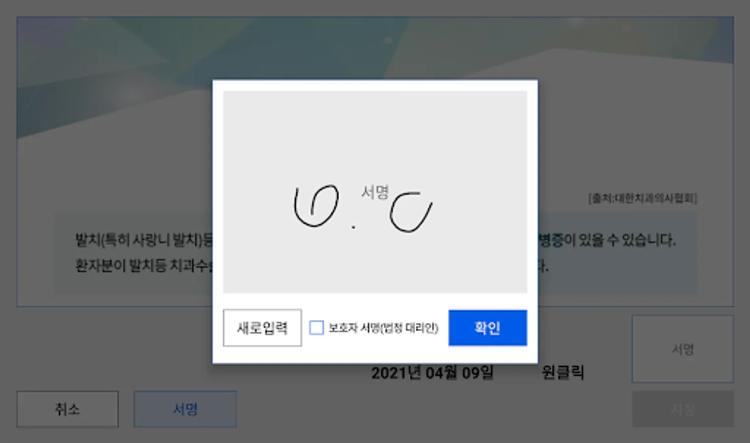 - 발치 동의서, 임플란트 동의서 등 진료와 관련된 각종 동의서 서명을 진행할 수 있습니다.
