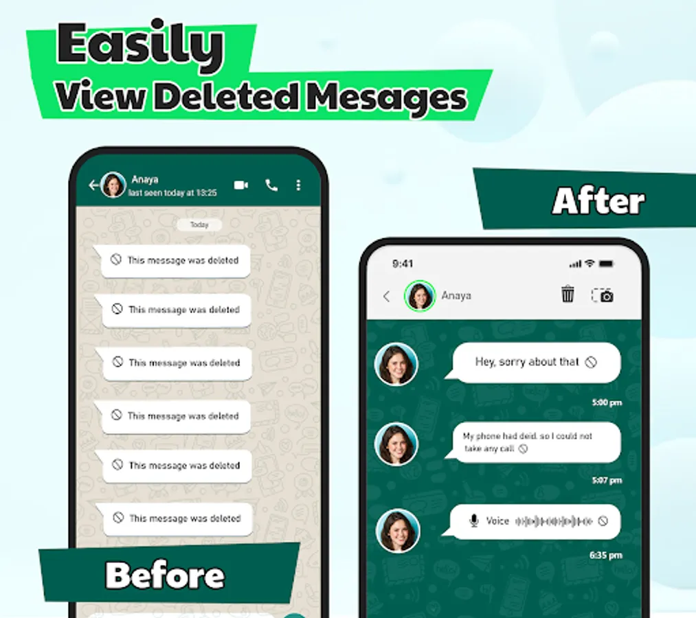 - Recover all deleted files from whatsapp like photos, videos & audios.