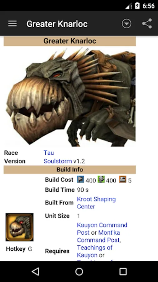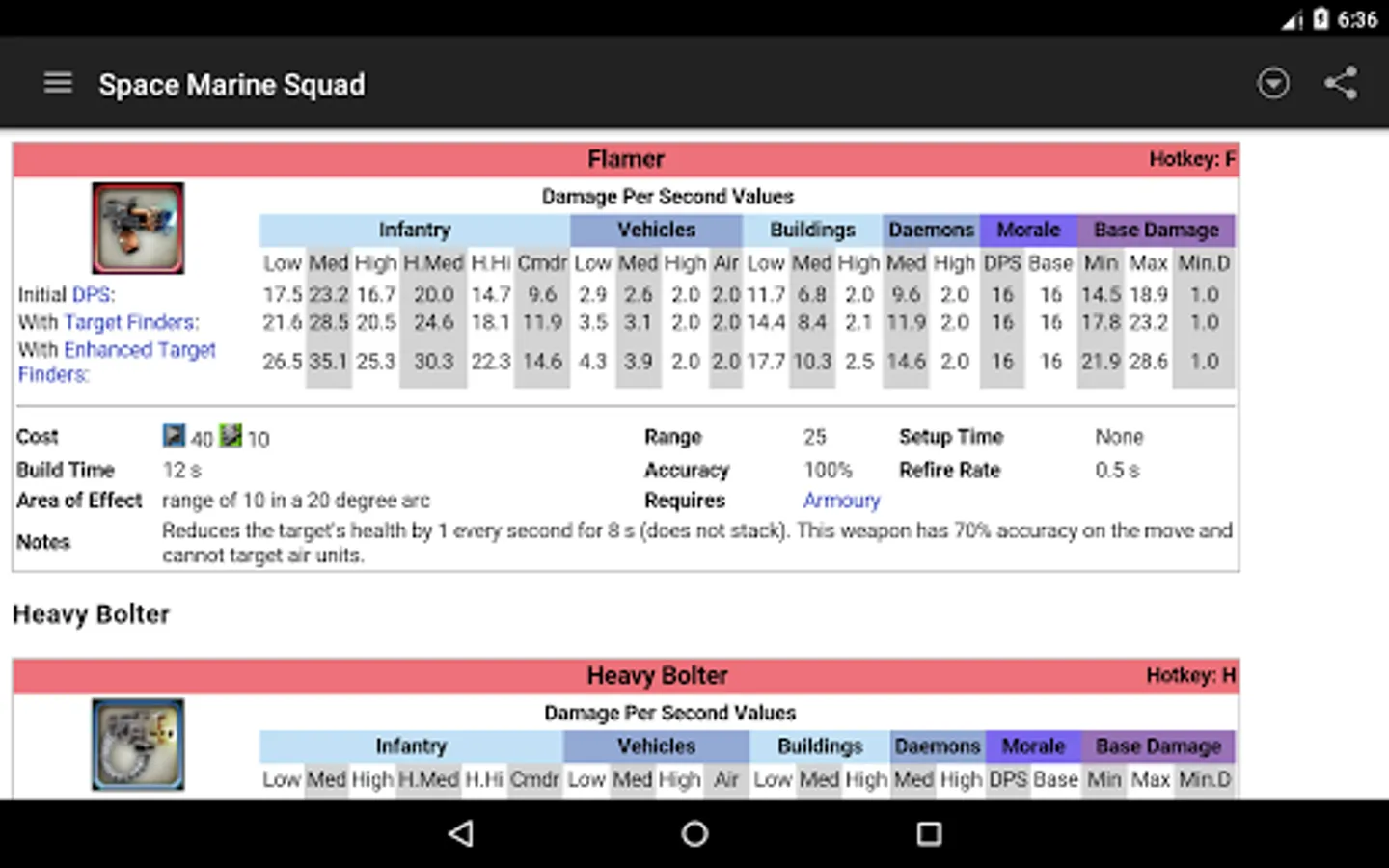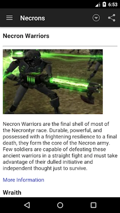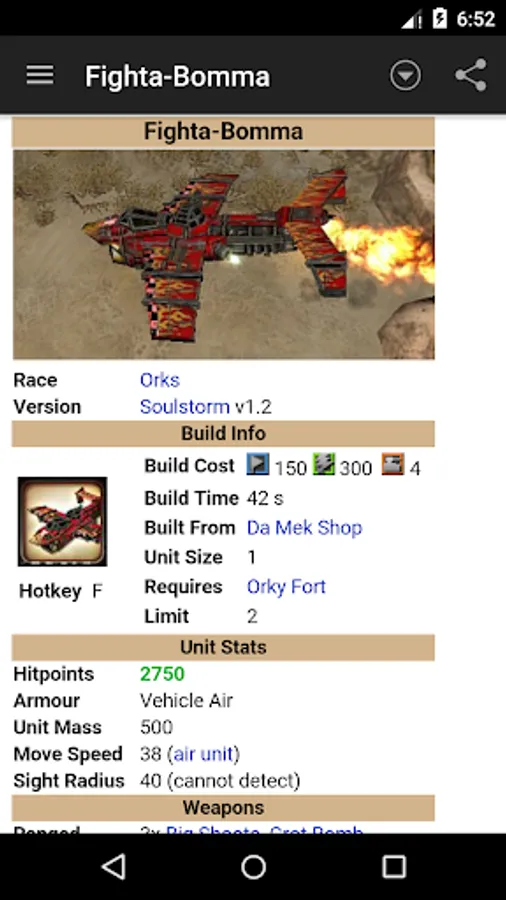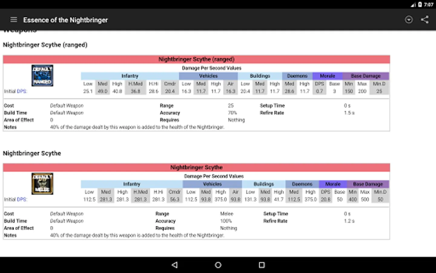 The application contains a description and characteristics of the infantry, vehicles, buildings for the races: