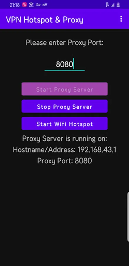 5.2.2 Open Proxy My Apps on the second android phone or TV, enter proxy address and port as shown on the VPN Hotspot and Proxy app separated by a colon, for example; 192.168.43.1:8080 (note the ":" separating the address and port) then click connect to allow all apps use the proxy.