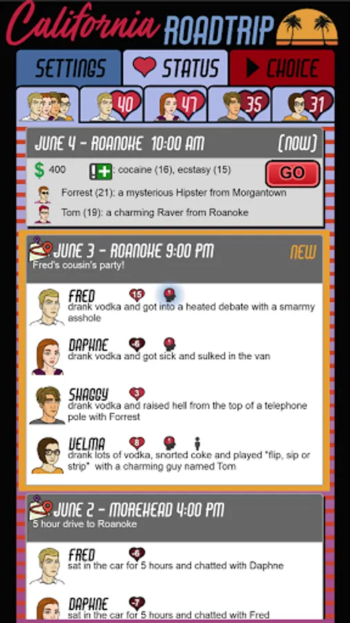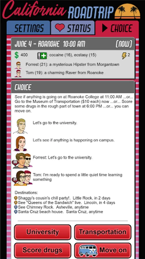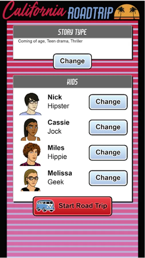 Choose different themes to change the types of events that can happen on your trip. Will it be a classic coming of age road trip story or a terrifying thriller?