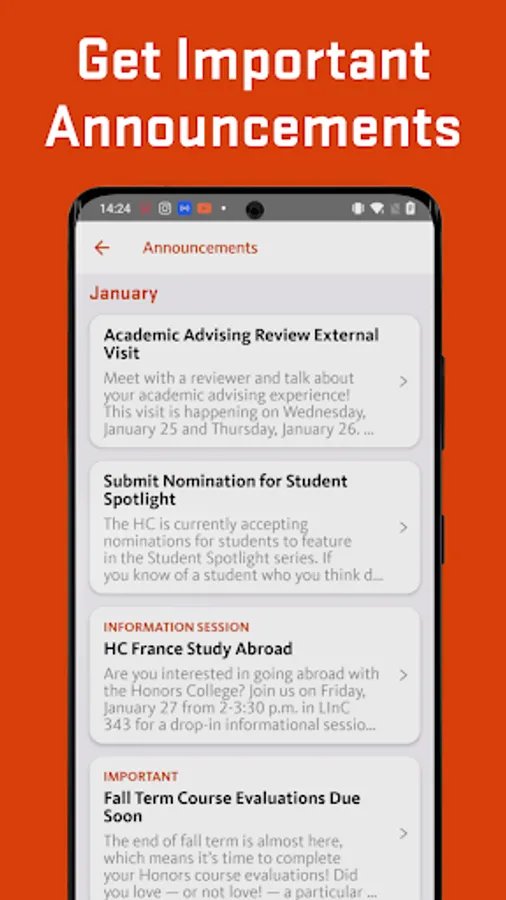 This year, we added a resources tab that shows you the latest announcements, building hours, and important links. Everything you'll need to be successful as an Honors student at Oregon State. You can even choose what announcements you want to receive as push notifications, so you never miss any important deadlines.