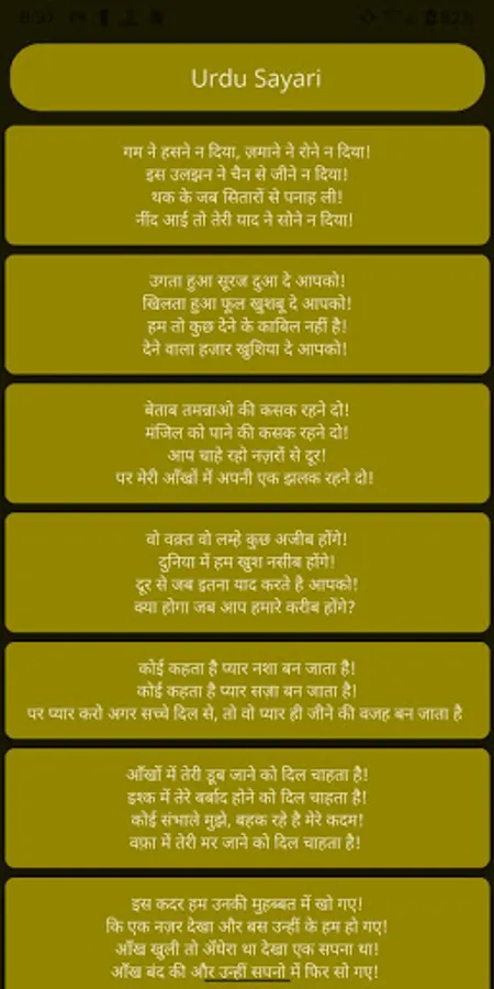 A small app to entertain you with amazing collection of Urdu and other Sayari with monthly update of new collections.