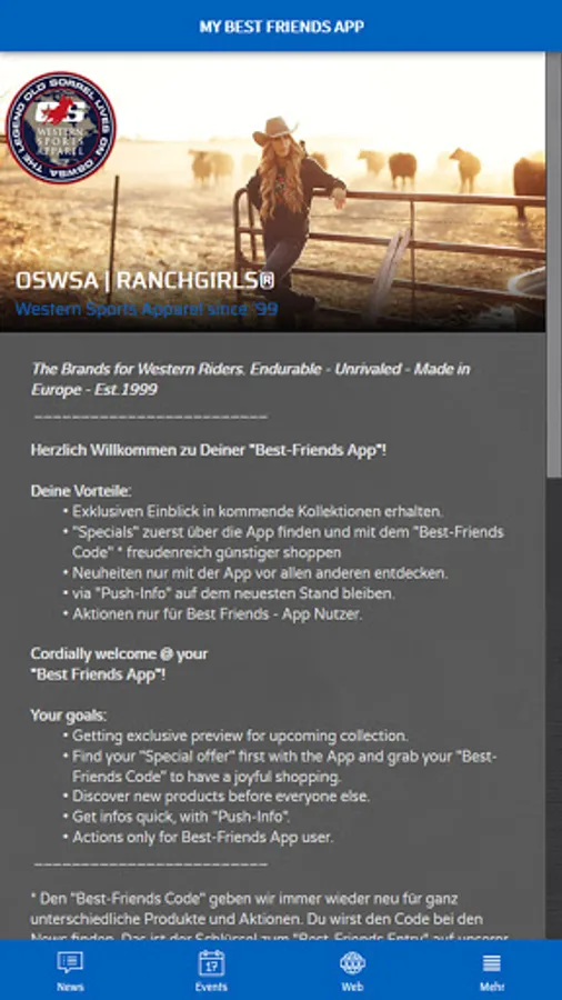 The official app of OS-Western Sports Apparel & Ranchgirls, the brands stand for clothing of the highest quality, made for western riders.