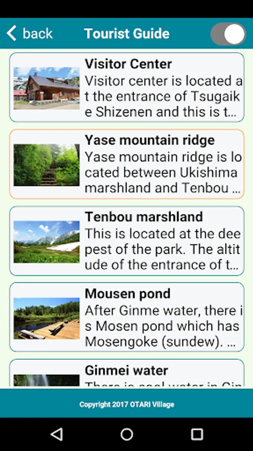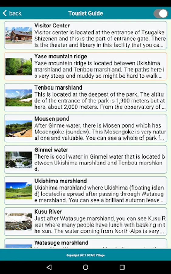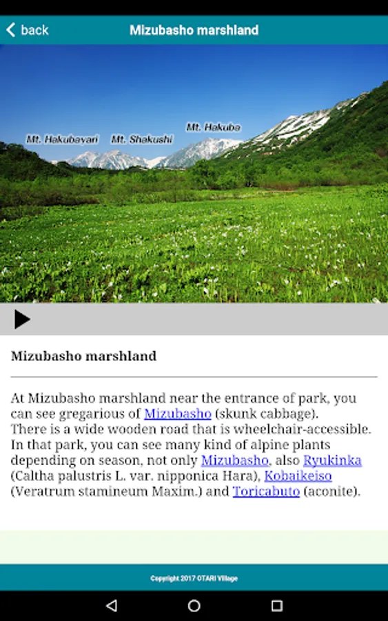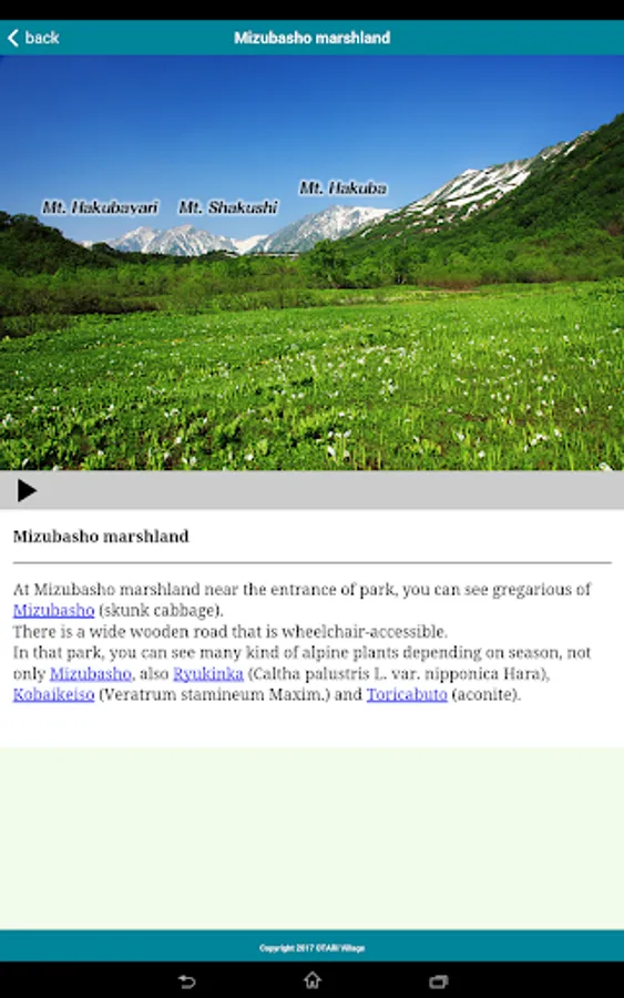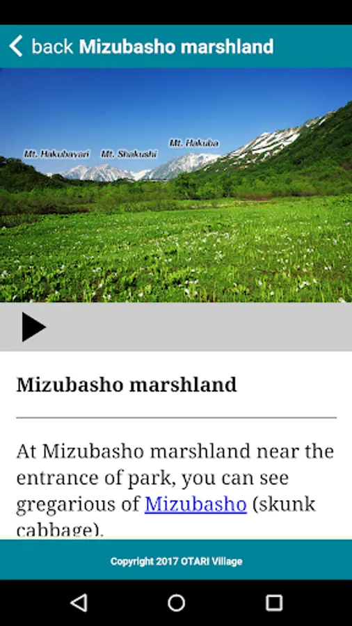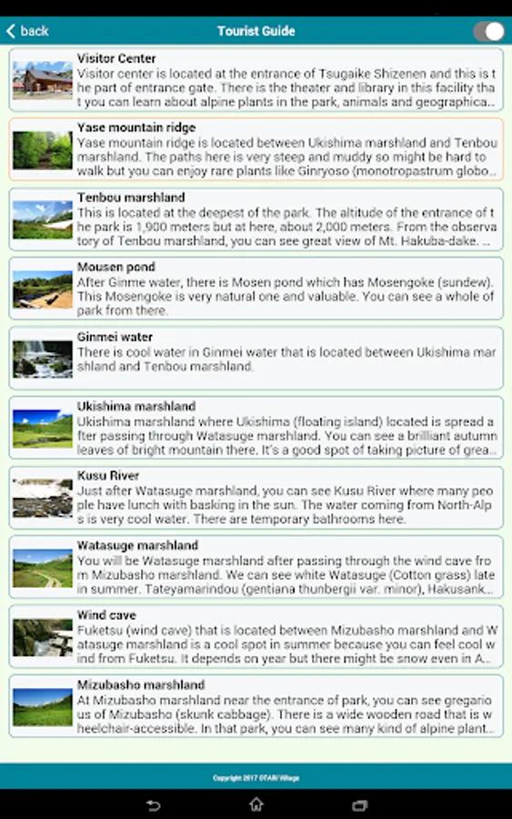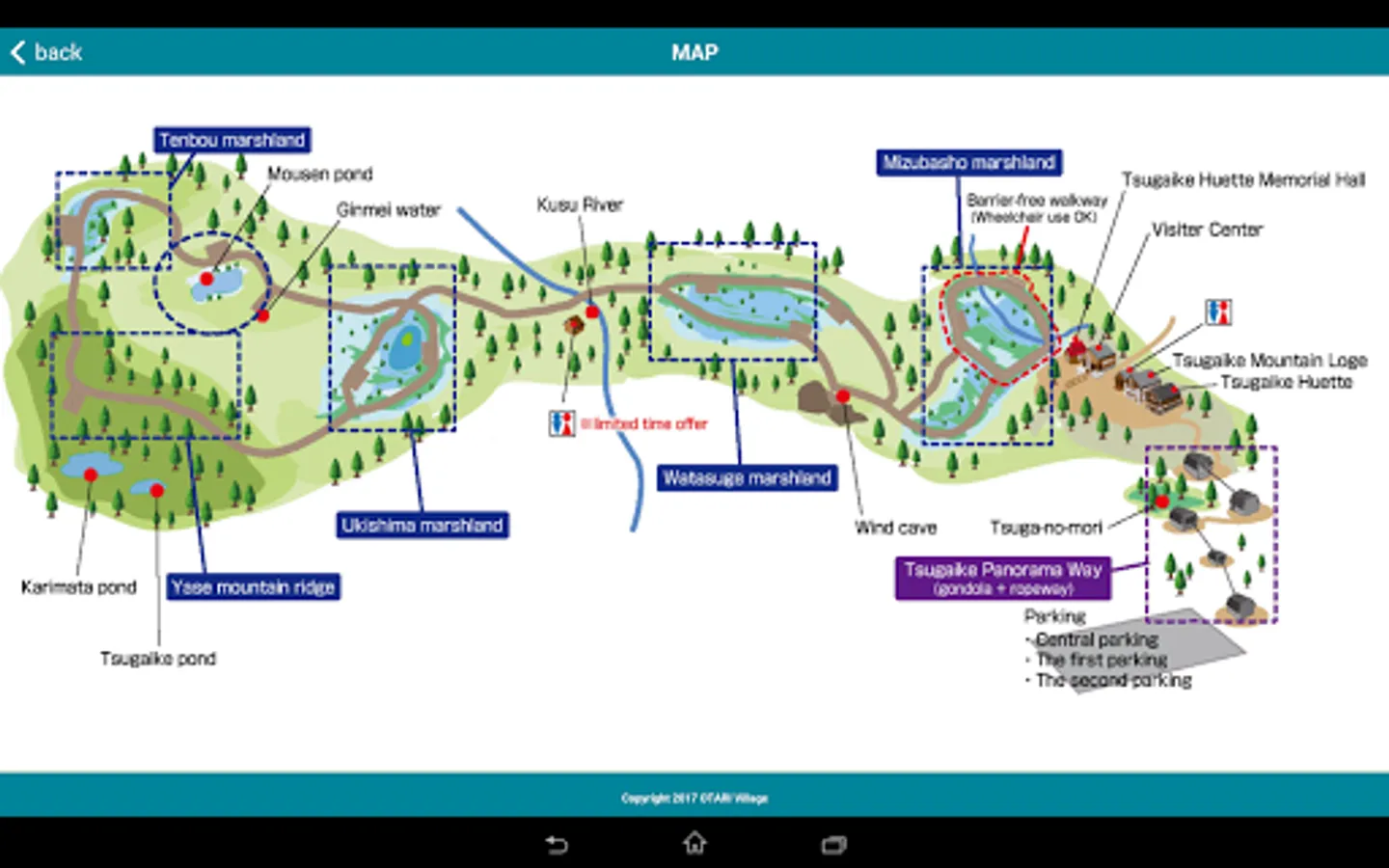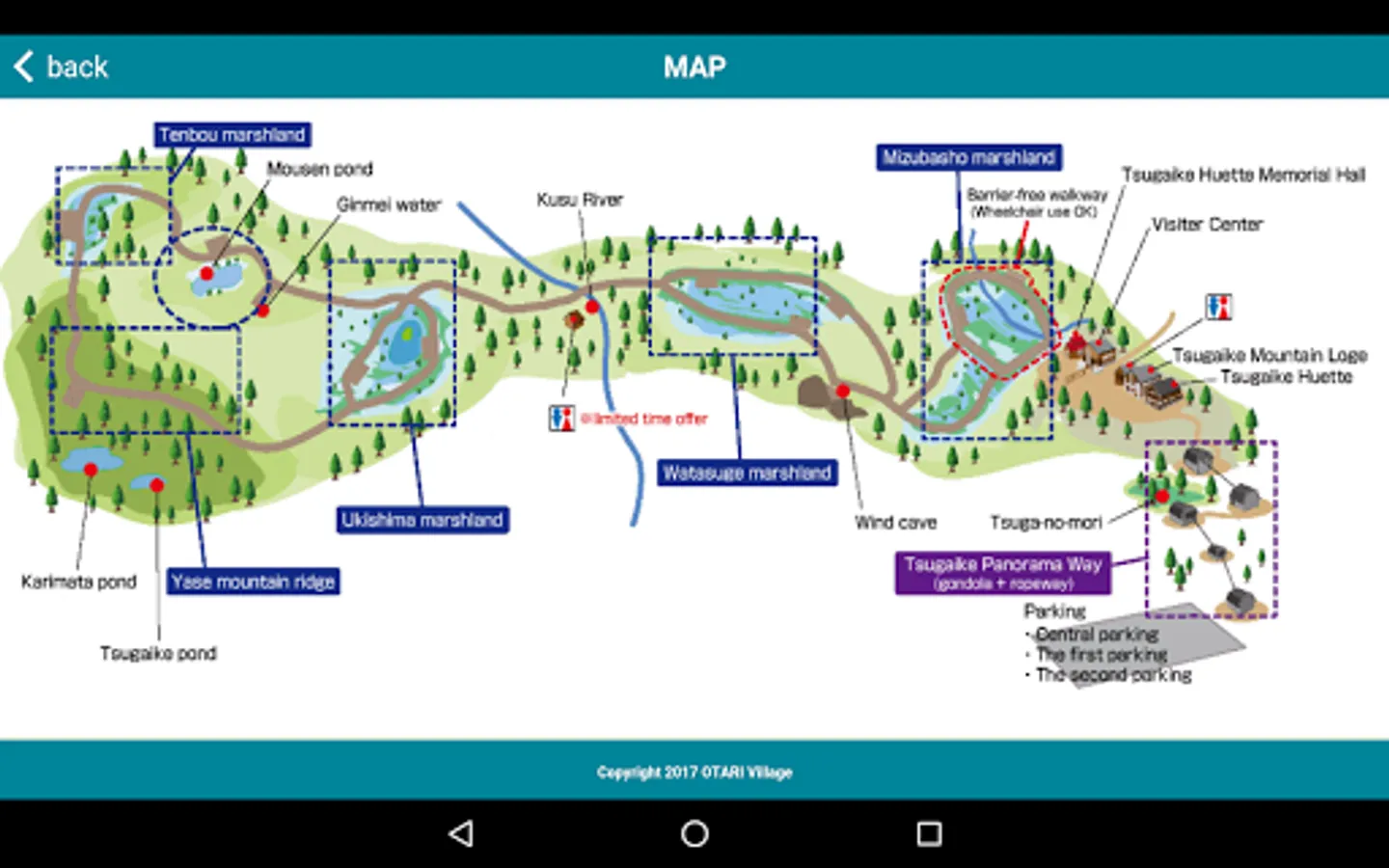 We guide you to Tsugaike Shizenen that has many kind of animals, plants and great nature. There are wooden paths in the park to walk through. It takes about 3hours and 30minutes or 4hours to see around the park, total distance is 5.5km. This app gives you a useful information for trekking and walking in Tsugaike Shizenen through four seasons.