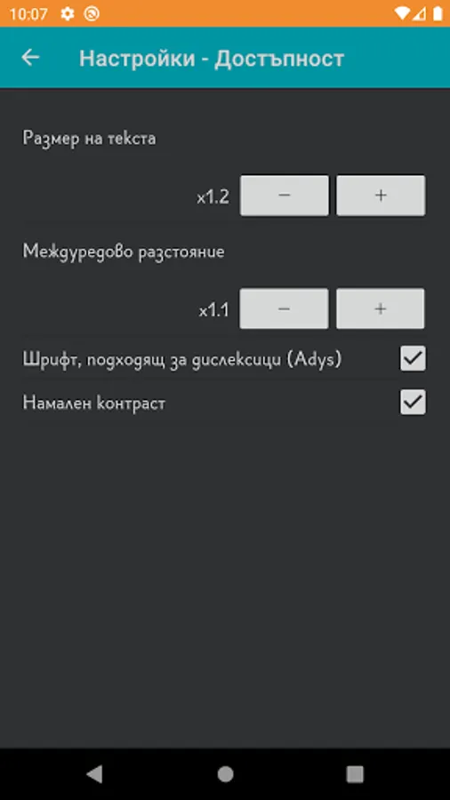 Приложението е адаптирано към нуждите на децата с дислексия, като е дадена възможност за използване на специален шрифт (Adys), регулиране размера на текста и междуредията, както и опция за намален контраст. Можете да регулирате тези настройки от Главен екран -> Настройки -> Достъпност.