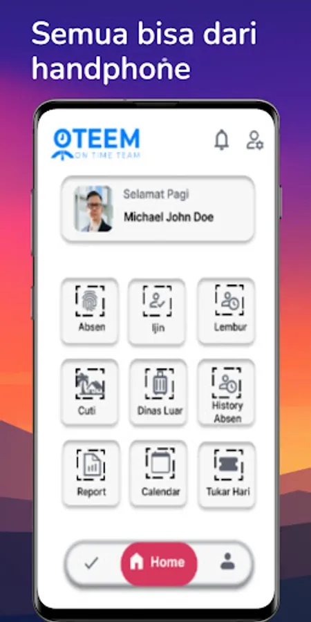 Mobile-based attendance application that can be used with the smartphone you have! Some of the features available are: application for leave, application for service, application for overtime, company calendar, application for change of days and daily absences.