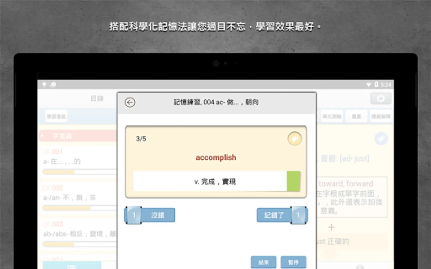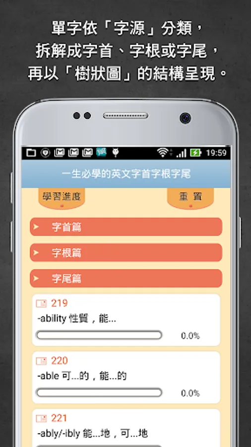 專為想背單字卻不得其門而入的學習者設計!不用抱著書死記、硬背,用全世界都在用的「單字拆解記憶法」,輕鬆將單字記起來!本 app 根據名師蔣志榆編著之「一生必學的英文字首字根字尾」一書製作而成,善用本書內容,讓您學習單字更有效率。
