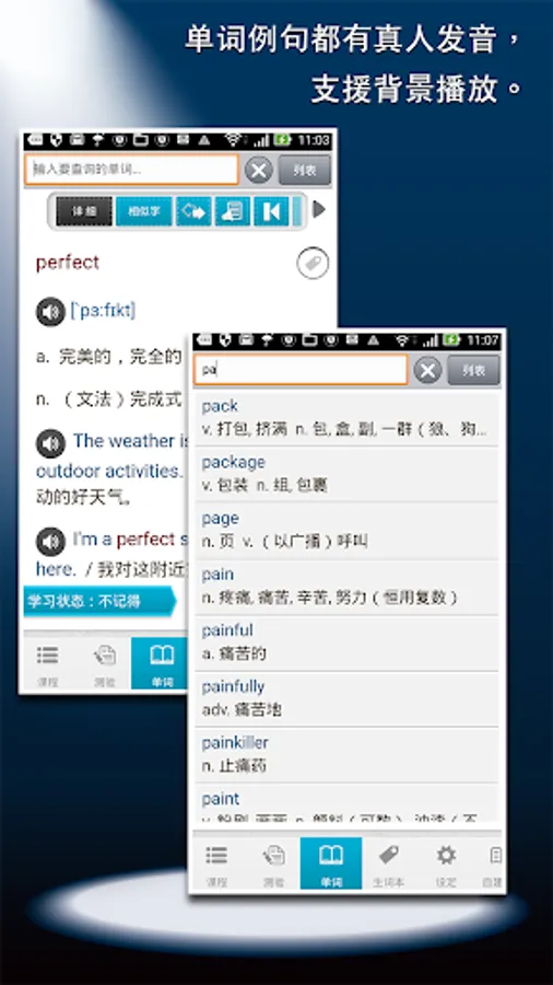 * 每个单词、片语和例句等都有专业美籍播音员真人发音。