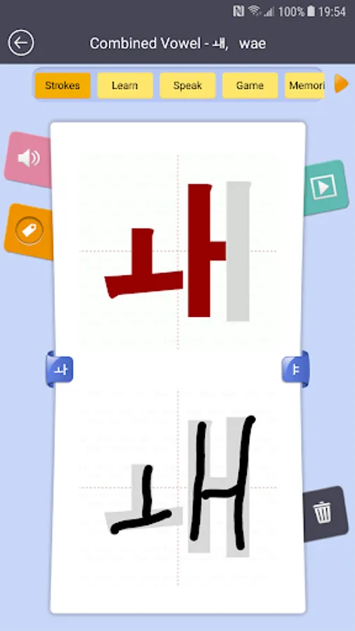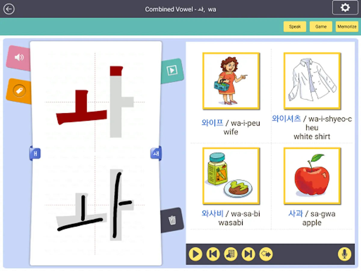 * Writing strokes display & Handwriting window tool let learners understand better how to write Korean correctly.