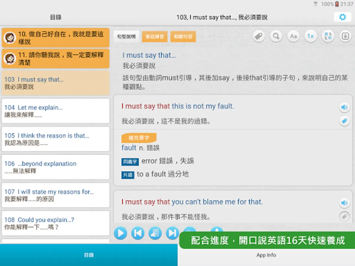 用最貼近老外的說法,學最實用的口語會話,不用背幾千個單字,不需記幾十個文法,用英語溝通很簡單,開口說一點都不難。本 app 根據名師蔣志榆編著之「勇敢開口說英語」一書製作而成,善用本書內容,不用出國學也能開口說流利的英語。