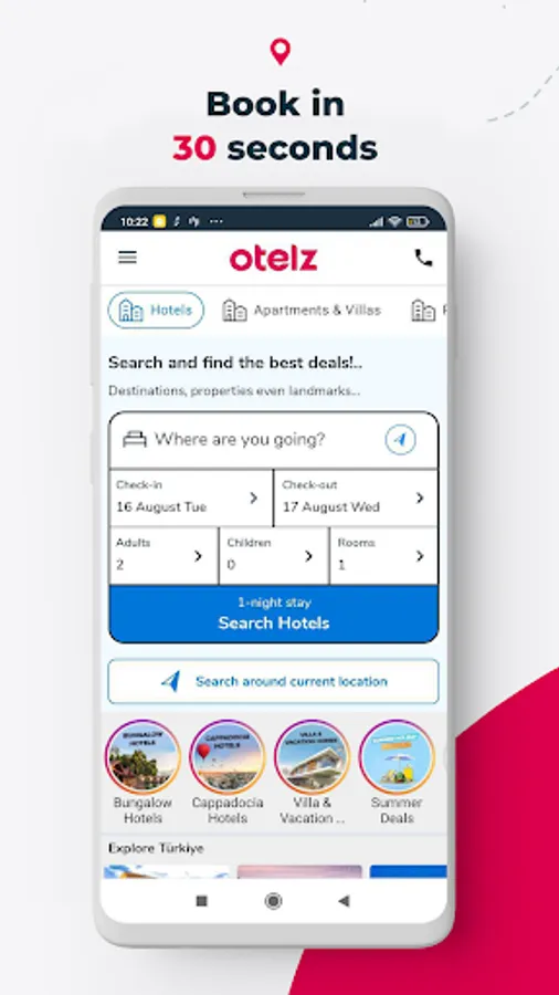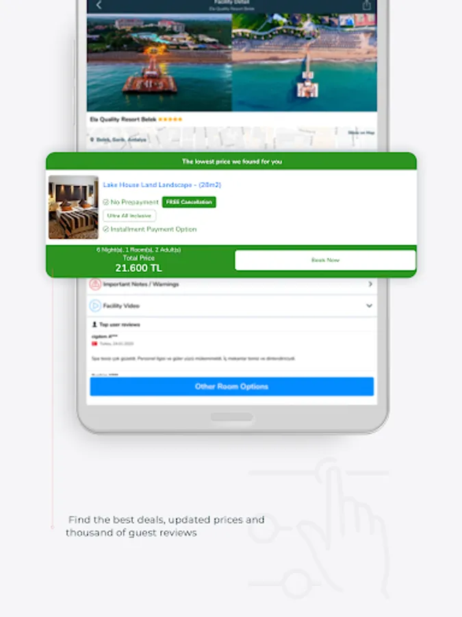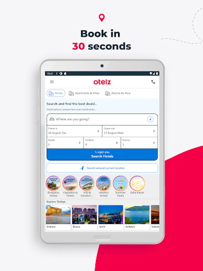 With Otelz.com; You can stay at the most affordable prices in hotels, apartments & villas, hostel, motel, bungalow and many other types of facilities, you can find early booking or last-minute deals, you can book a hotel without prepayment and have the opportunity to make your payment at the hotel, and you can take advantage of accommodation opportunities such as Rooms by Hour and HotelOffice.