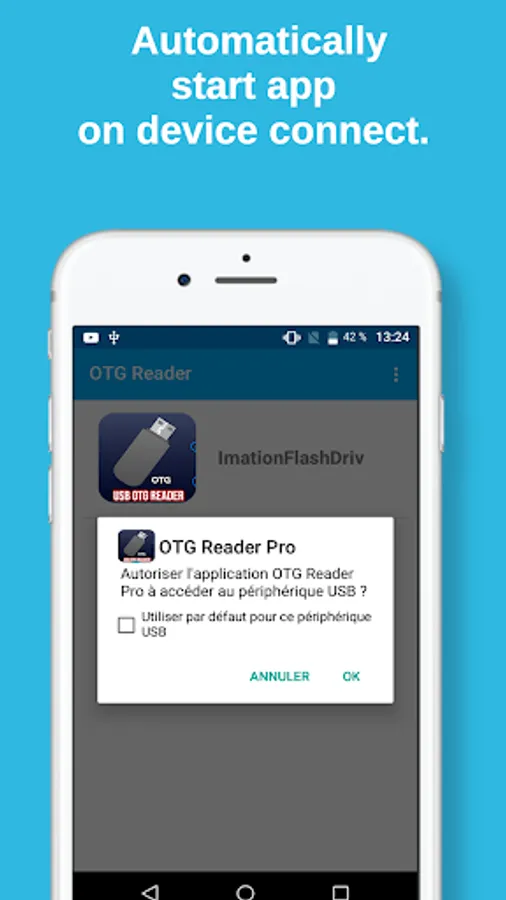 USB OTG Reader helps you to to browse USB flash drives .as well as card readers from your phone or tablets. All you've got Associate in Nursingd do} is connect the flash drive to an OTG (On-the-go) cable then introduce the small USB connexion of your pill, or mouse or LAN adapter then open this app you'll see all files in USB drive and you'll be able to open them together with your favorite app viewers or editors. Current support FAT32 disk format of flash drives. Note; fatless version limit line size to 30mb, if you would like to open file larger than 30mb, please take into account Usb OTG Reader.