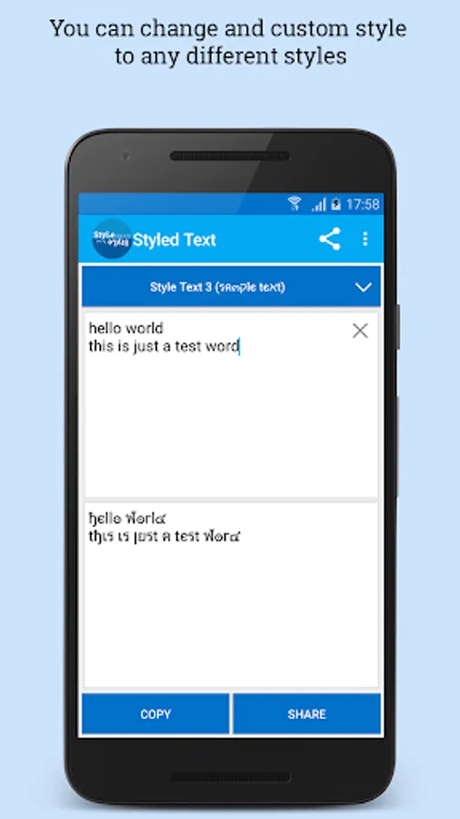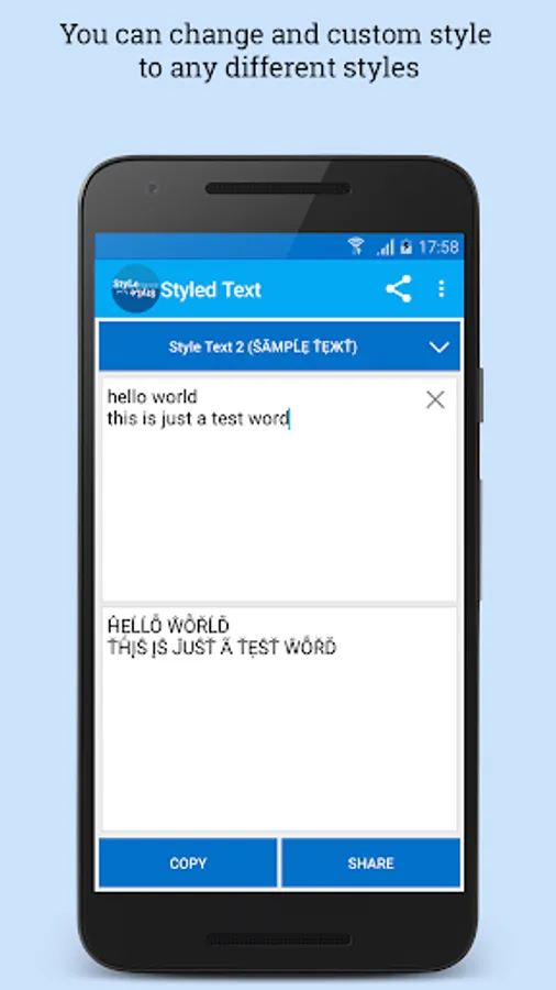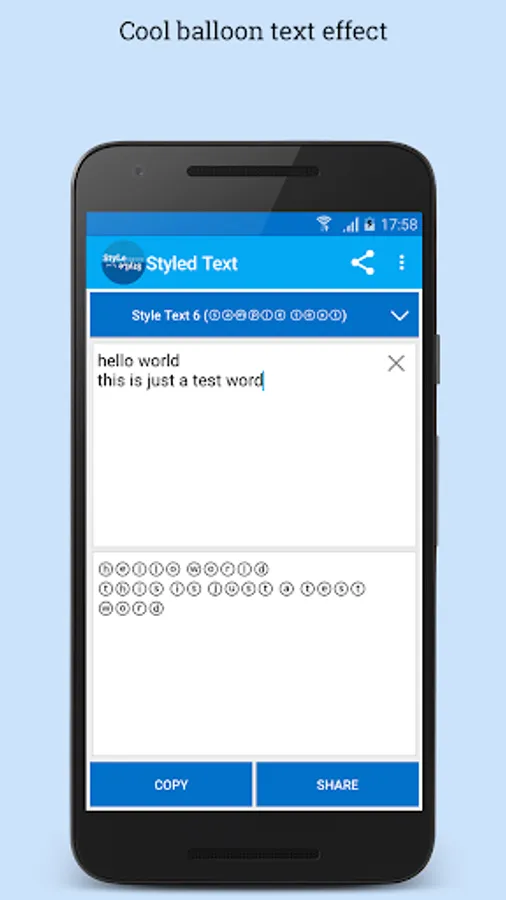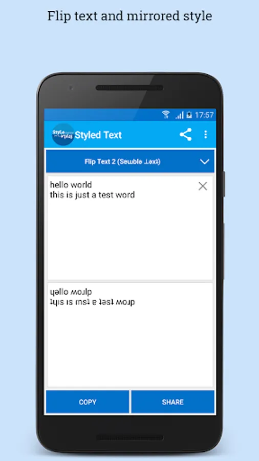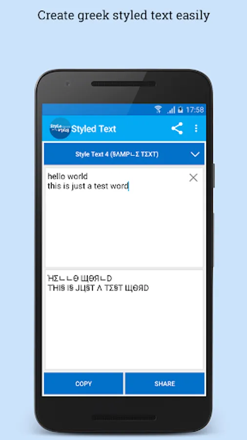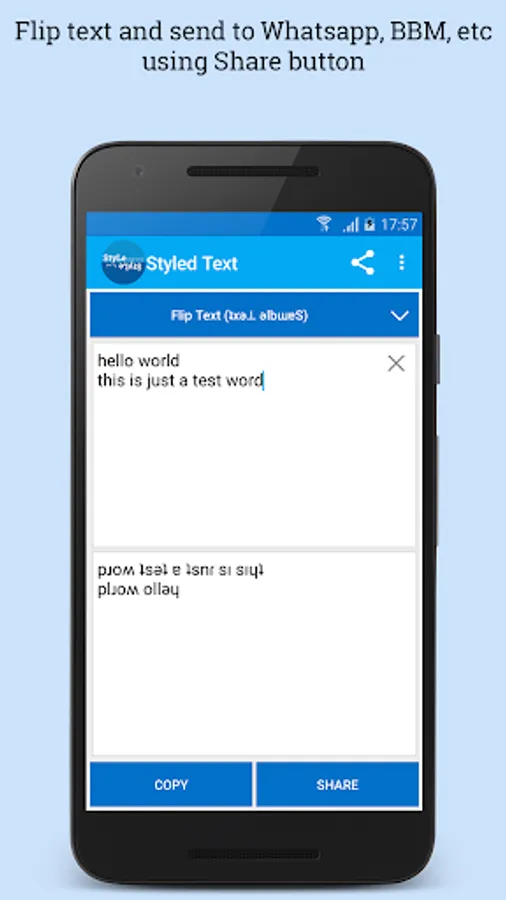 Create styled text: flip text, mirror text, wave text, balloon effect, greek text, latin text easily and share to whatsapp, BBM, Facebook, Twitter, etc