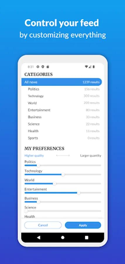 You have complete control over sources, categories and the amount of articles in each category. You can enable and disable publications as you see fit. You can see how we customized the feed to your preferences, and manually adjust every single thing we did. There are no black boxes - you are in control.