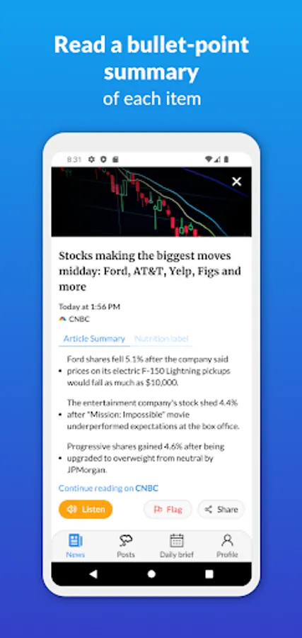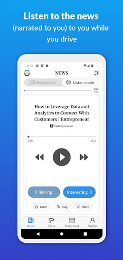 If you like the topic of an article, swipe right (and you’ll see more articles on this topic over time). If you find the topic boring, swipe left (and you’ll see less). If you want to listen rather than read, click a button (or say “listen”) and we’ll play the summary for you. If you want to comment or share, it’s one button-click (or voice command) away.
