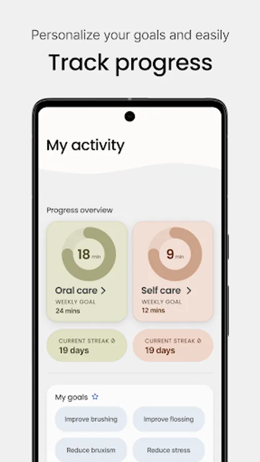 The purpose of this app is to help users maintain and learn more about the importance of oral health and wellness. Based on the oral and mental health assessment information collected, the app will help you set personalized goals to improve your oral and mental health – all at your own pace. Track week-by-week progress by completing goals in the ‘My Activity’ page, and earn rewards for reaching your goals and maintaining routines.