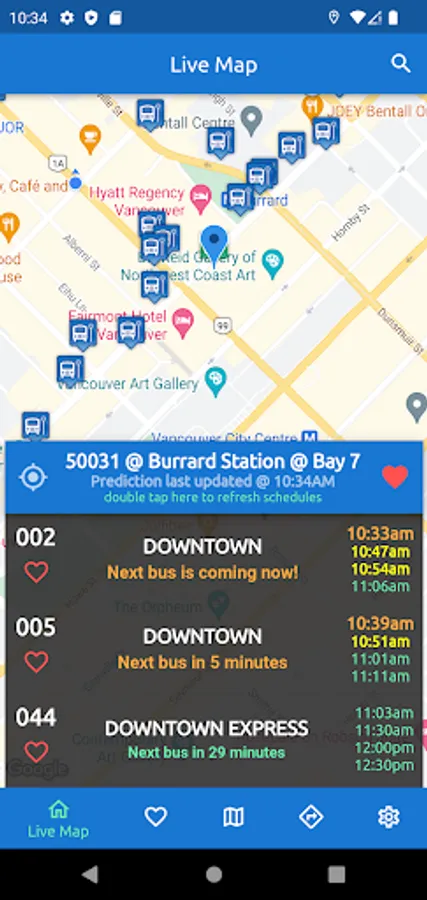 Vancouver Transit Live allows you to comprehensively search Vancouver BC's TransLink bus schedules to get live updates on buses coming to the stops you select.