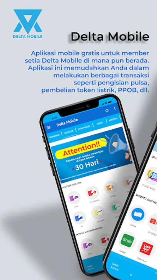 The Delta Mobile android application is a free mobile application for loyal members of Delta Mobile wherever they are. This application makes it easy for you to carry out various transactions such as topping up pulses, buying electricity tokens, PPOB, etc.