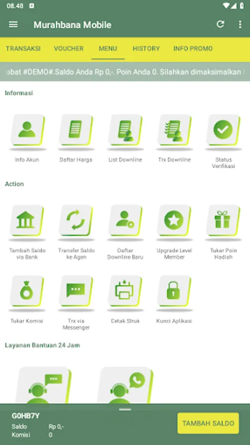 With this application, you can easily check the latest credit prices, see a recap of transaction history, change your balance history, downline activities, chat with customer service, and so on.