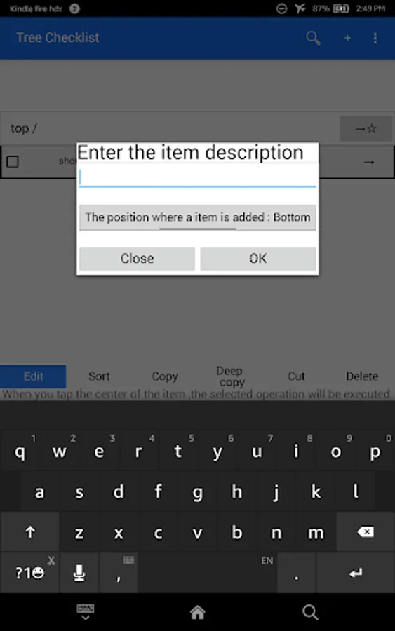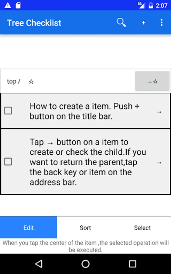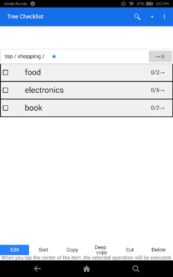 select a item to operate it.If you tap the selected item, it is deselected.If you select one or more items,the operations (cut,copy,deep copy,delete)are shown at the bottom of display.