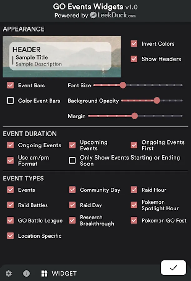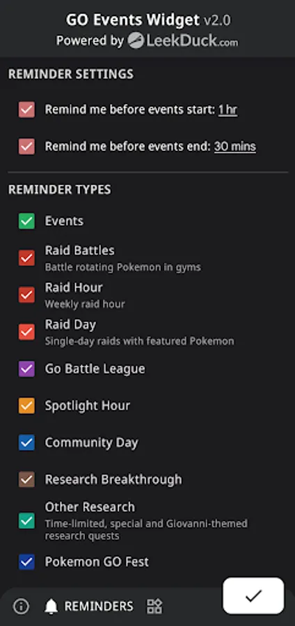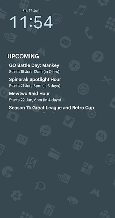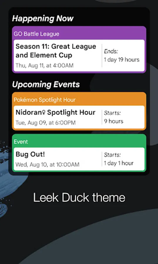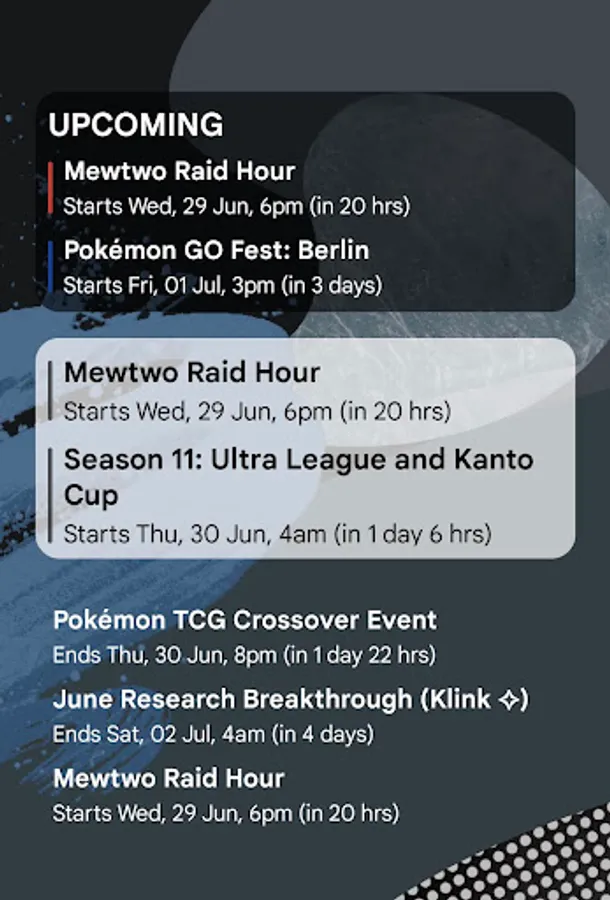 Go Events Widget provides a listing of all ongoing and upcoming events, so you will never miss out that raid hour or community day.