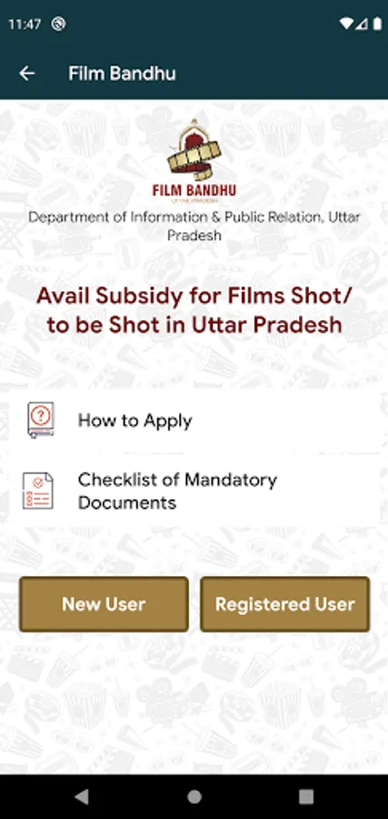 To Avail Subsidy for Films Shot/to be Shot in Uttar Pradesh, Applicants will have to get themselves registered on the Mobile App in few simple steps and furnish the details required to avail Film Subsidy. After submission of details, Film Bandhu and other concerned Government Authorities will scrutiny the details and grant Film Subsidy, if found feasible.