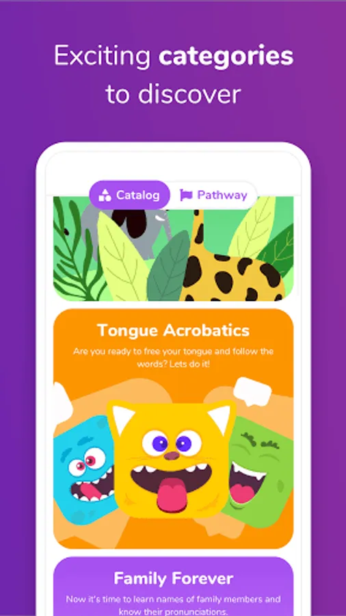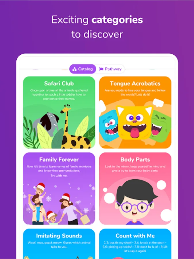 The Otsimo | Speech Therapy app consists of 15+ categories, including First Words, Basic Shapes, Body Parts, Safari Club, Tongue Acrobatics, Rainbow Splash! Each category is designed to stimulate sound production of the child.