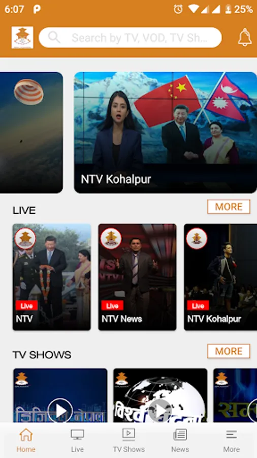 Nepal Television (Nepali: नेपाल टेलिभिजन abbreviated in English as NTV) is one of Nepal's largest broadcasting organizations in studio and transmitter infrastructure, it was established on December 31, 1983. NTV, which also broadcasts on digital terrestrial transmitters, provides 4 television channels, online and mobile app service. It has recently Introduced OTT Mobile App to expand its reach to everyone's hand.