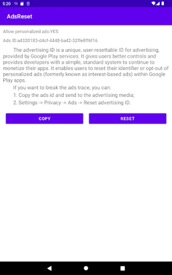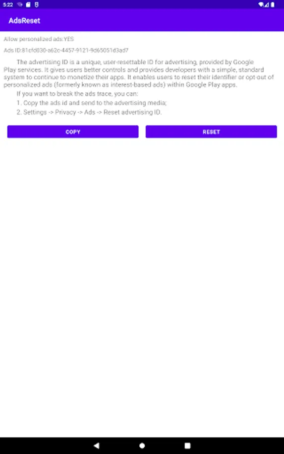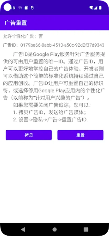 Android device's GAID(Google Advertising ID) has the same role with iOS device's IDFA(Advertising IDentifier), and the app can help you to find and copy it easy.