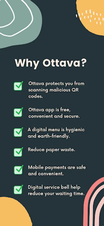 Ottava protects you from malicious QR codes. Each Ottava QR is safety checked and digitally signed by us. Ottava app automatically stops when an unsafe QR code is present.