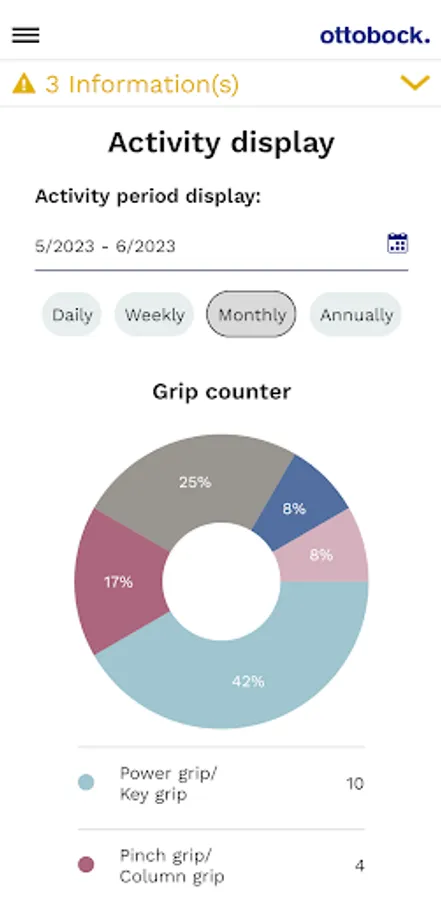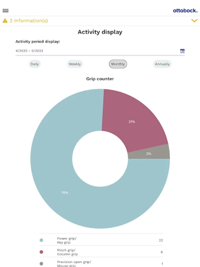 The optional Myo Connect function records activity data for your prosthesis and presents it clearly for you in the Myo Plus app. This means that you can independently access up-to-date information about how you are using your prosthesis.