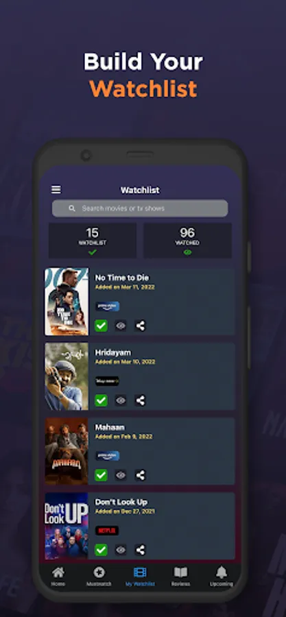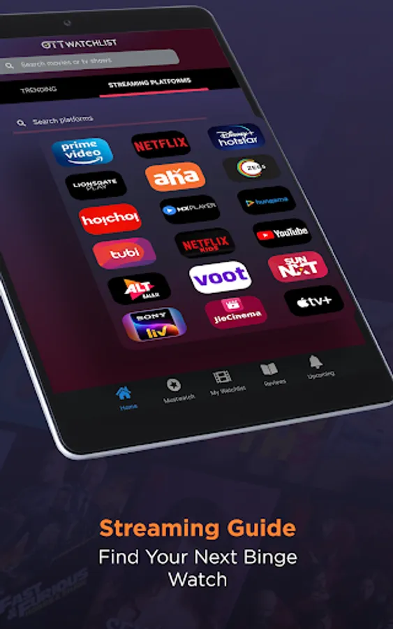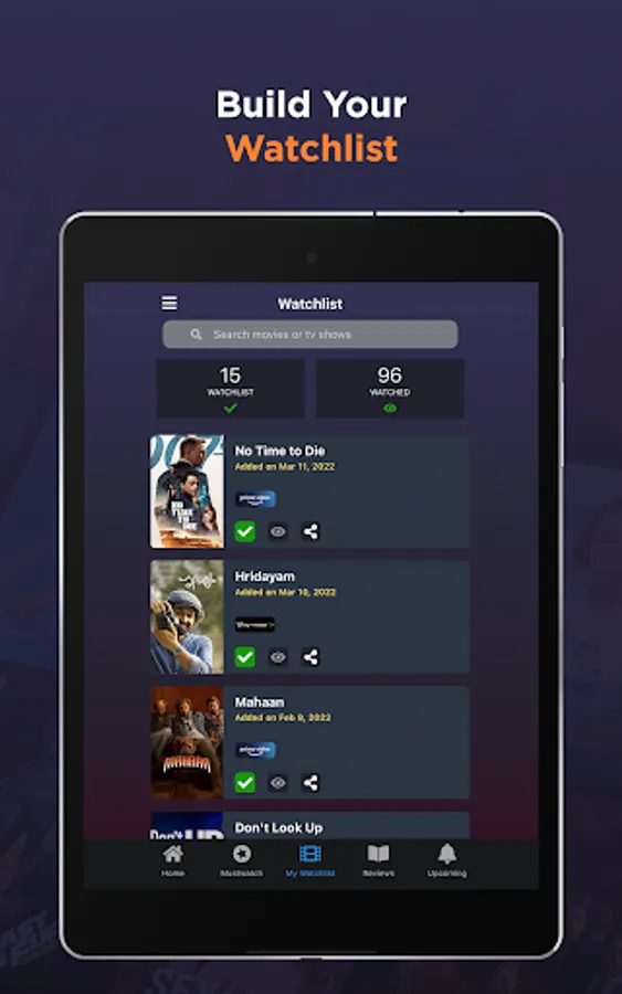 App supports watch list creation from multiple streaming platforms such as Hulu, HotStar, Amazon Prime, Netflix and more.