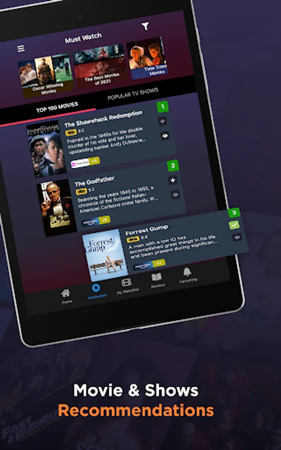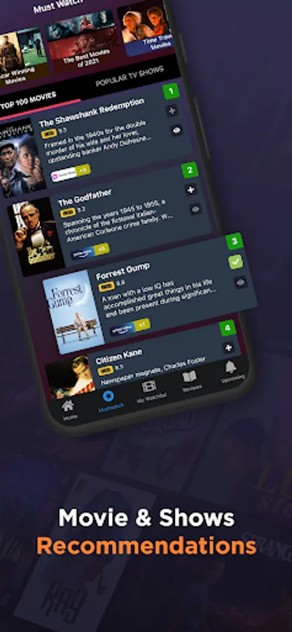Apart from your personalized movies list, the app also features must-watch popular movies list of all time. You can browse the top 50 and top 100 collections and best movies and TV series to watch on your streaming platform by using this app.