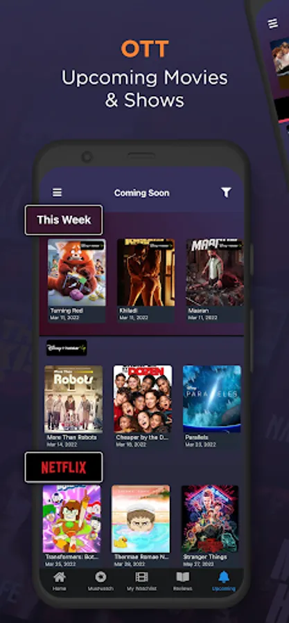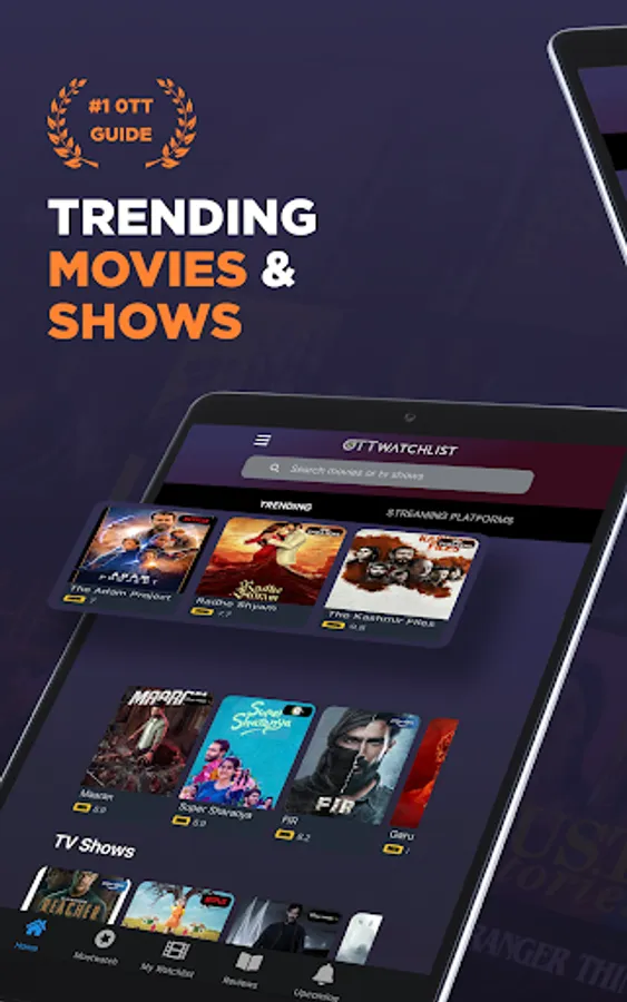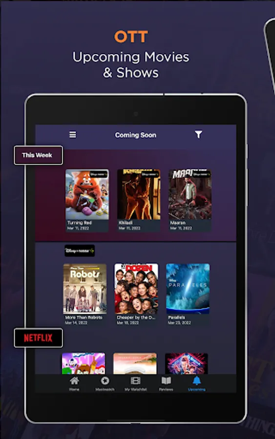 Notifications of new arrivals on OTT updates complete with premiere dates and times so you never miss a moment. Create a personal watchlist of shows and movies before they air with streaming dates and upcoming releases categorized by genre and streaming platforms.