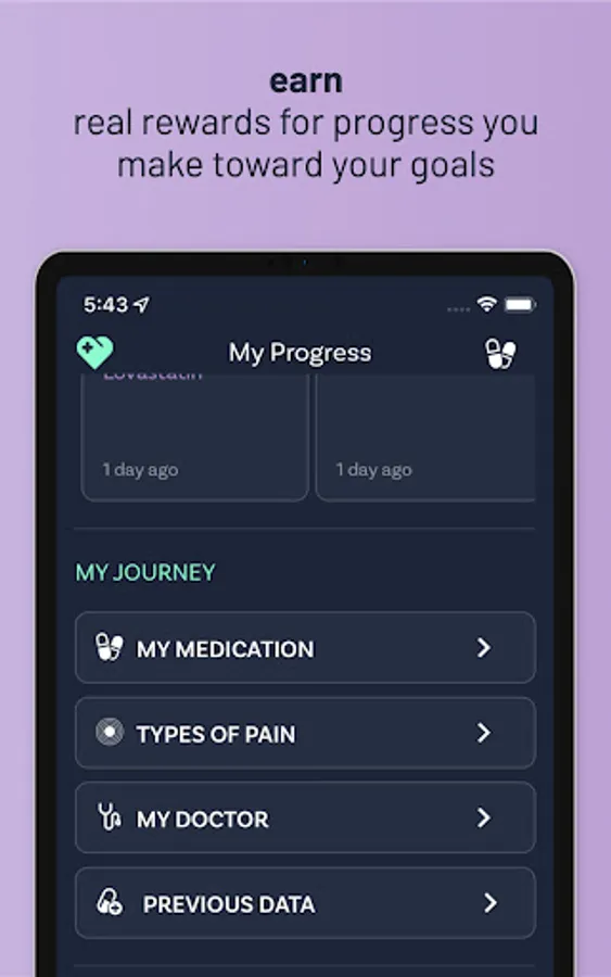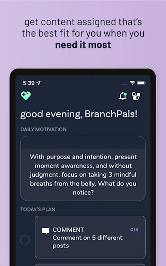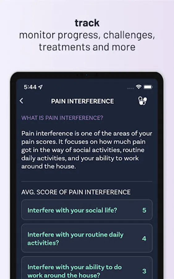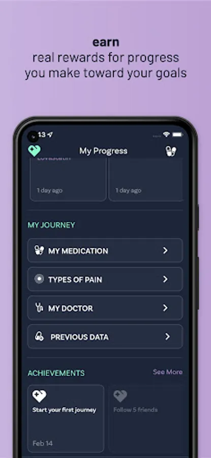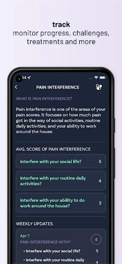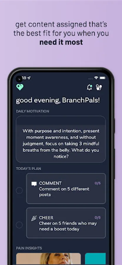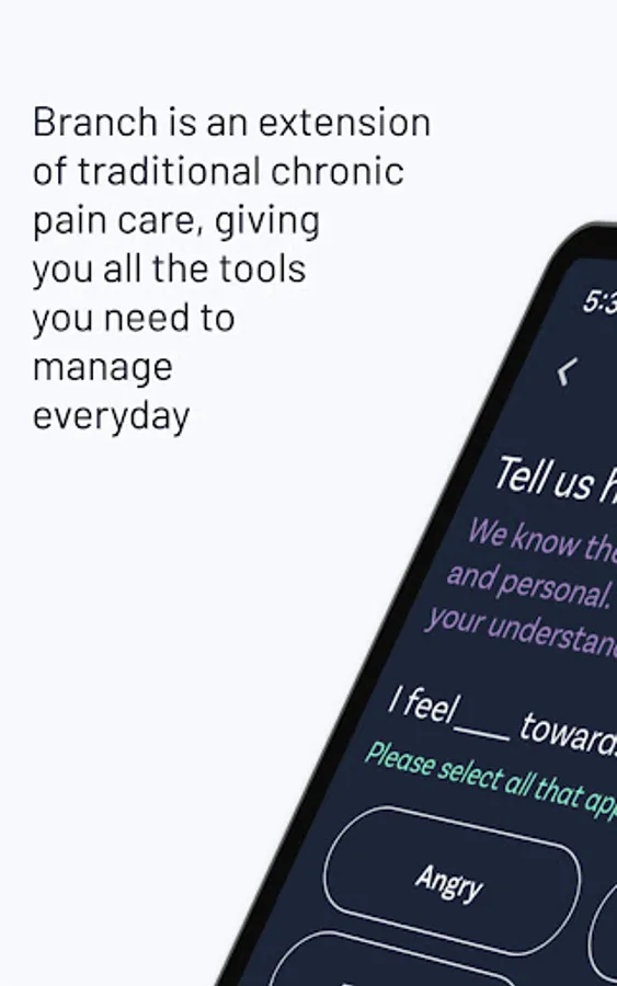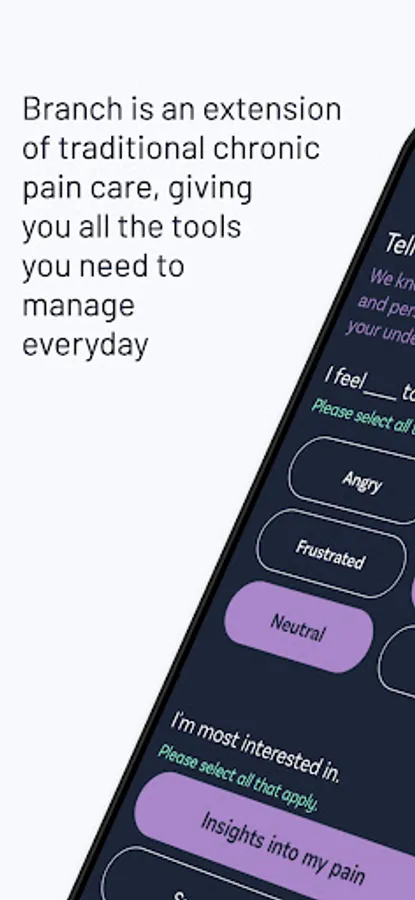 Track your pain. Create your personalized journey by updating your Branch Health profile with your specific pain type or condition. You can record changes to your pain level, medication usage, treatments, mood, sleep patterns, accomplishments, challenges, goals, and more.