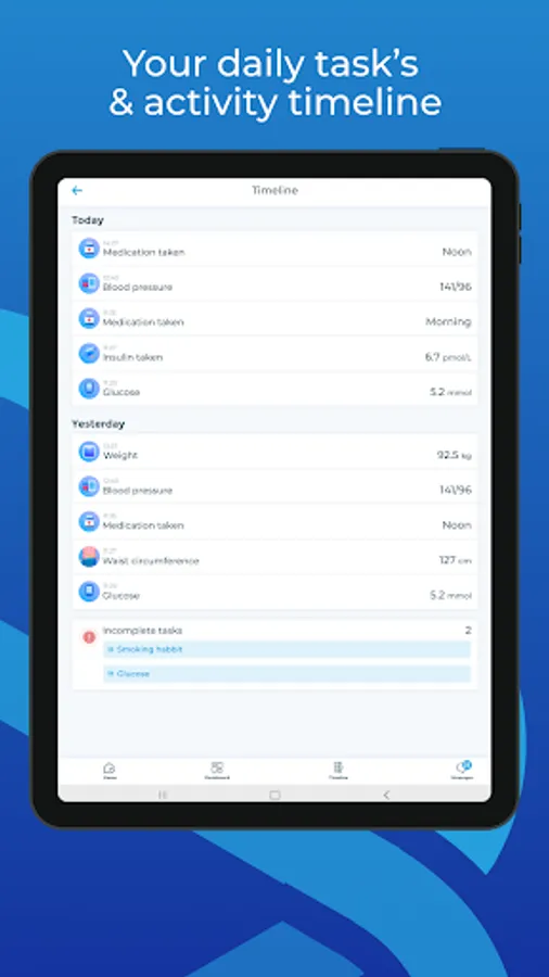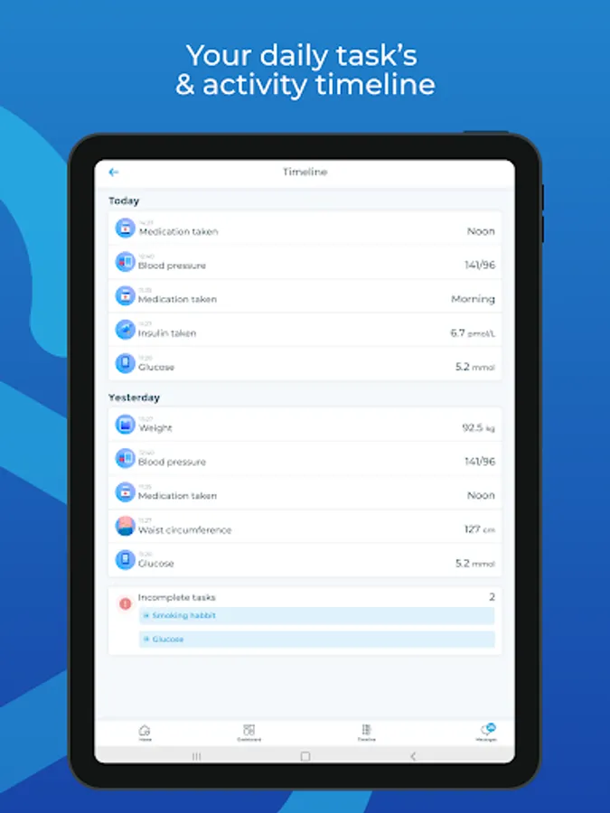 The Elderly Care app assumes that all people are best served with a personal treatment plan. Our mobile application is part of a digital disease management system provided through the primary care system. The application leverages each participant's unique health metrics and data, applying artificial intelligence (AI) to analyze health data.
