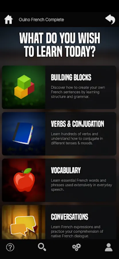 The key to learning a language is not to remember pre-made sentences, but to learn the building blocks to make your own sentences. OUINO French is based on this concept; you will gain knowledge of each individual part of a sentence in detail, discover a massive amount of vocabulary, and become skilled at using several verbs in French.