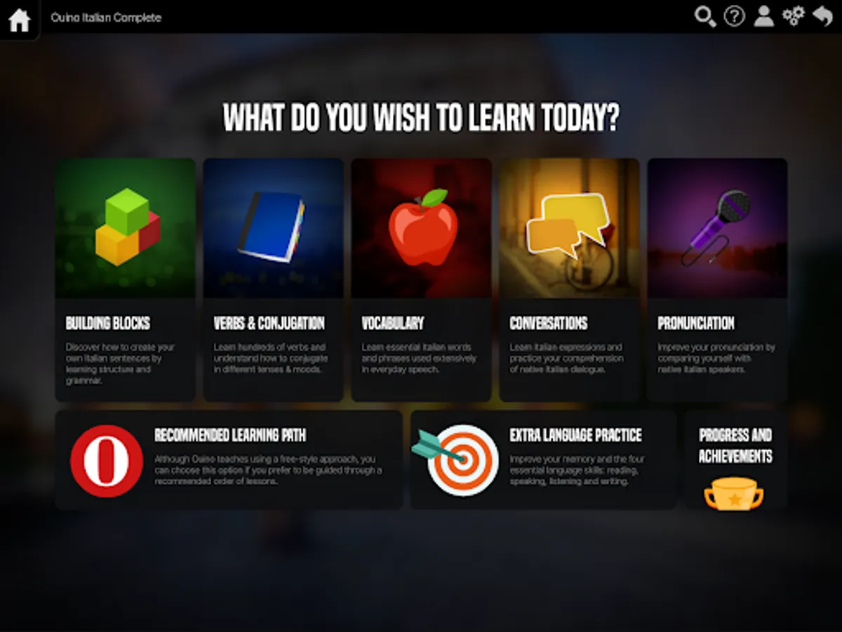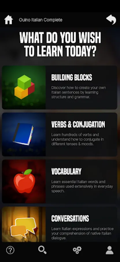 The key to learning a language is not to remember pre-made sentences, but to learn the building blocks to make your own sentences. OUINO Italian is based on this concept; you will gain knowledge of each individual part of a sentence in detail, discover a massive amount of vocabulary, and become skilled at using several verbs in Italian.