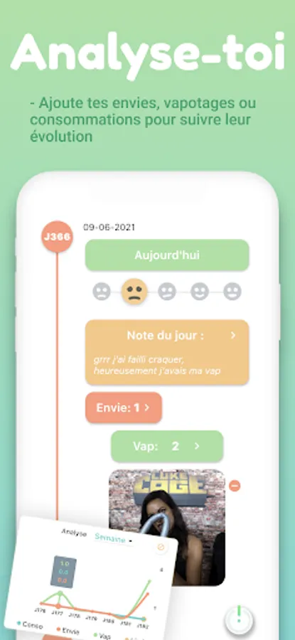 Because each craving or relapse has its reason, Ouiquit provides a logbook allowing you to simply view and analyze your cravings and relapses according to the context of the day and the method used. You will be able to define the best possible strategy.