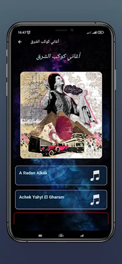 مجموعة كبيرة من أعمال أم كلثوم: استمتع بتجربة استثنائية مع تطبيقنا الذي يوفر مجموعة واسعة من أشهر أغاني وألحان أم كلثوم. استمع إلى أصواتها العذبة وأداءها المذهل في كل أغنية تستكشفها.