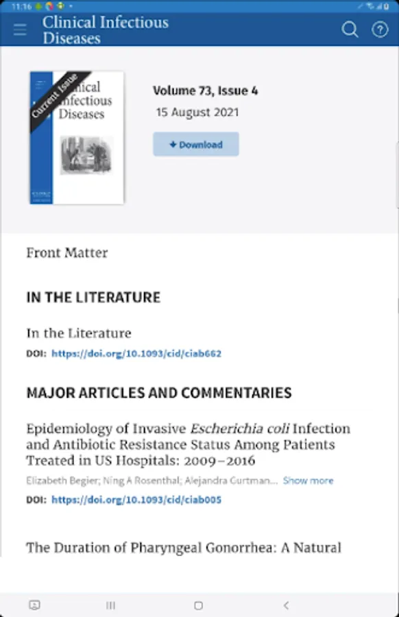 The IDSA (Infectious Diseases Society of America) Journals app from Oxford University Press enables you to read the leading journals Clinical Infectious Diseases, The Journal of Infectious Diseases, and Open Forum Infectious Diseases both online and offline on your Android device (provided you have a relevant personal subscription, institutional subscription, or society membership).