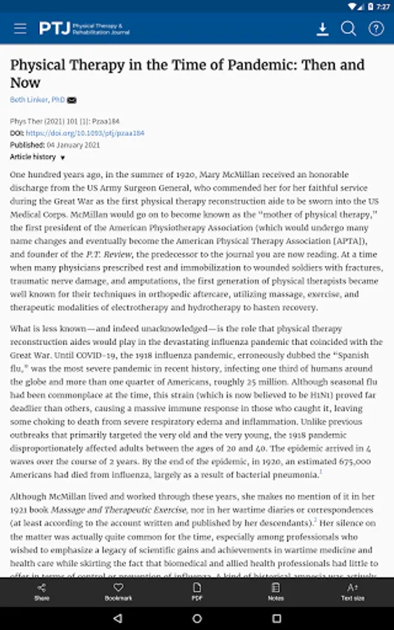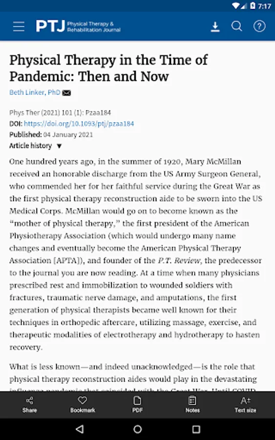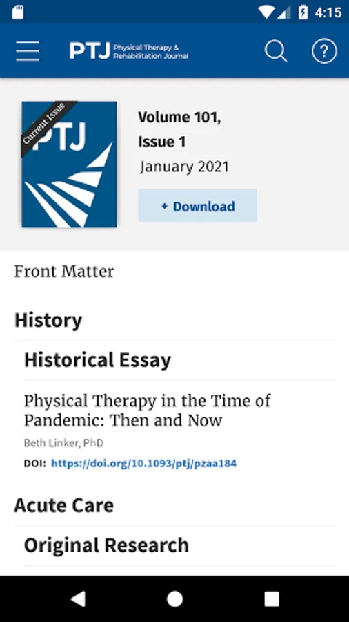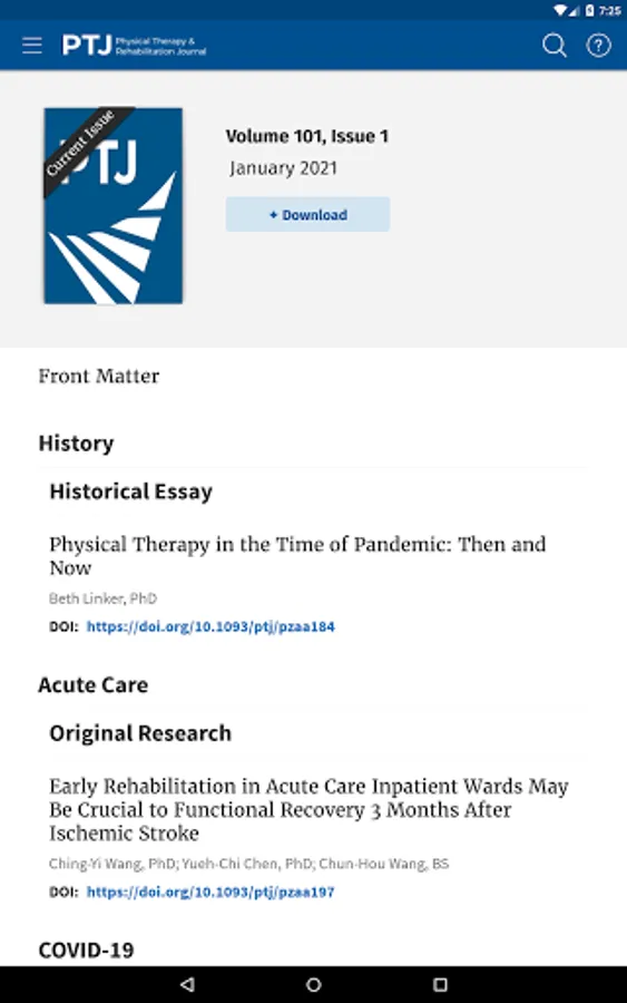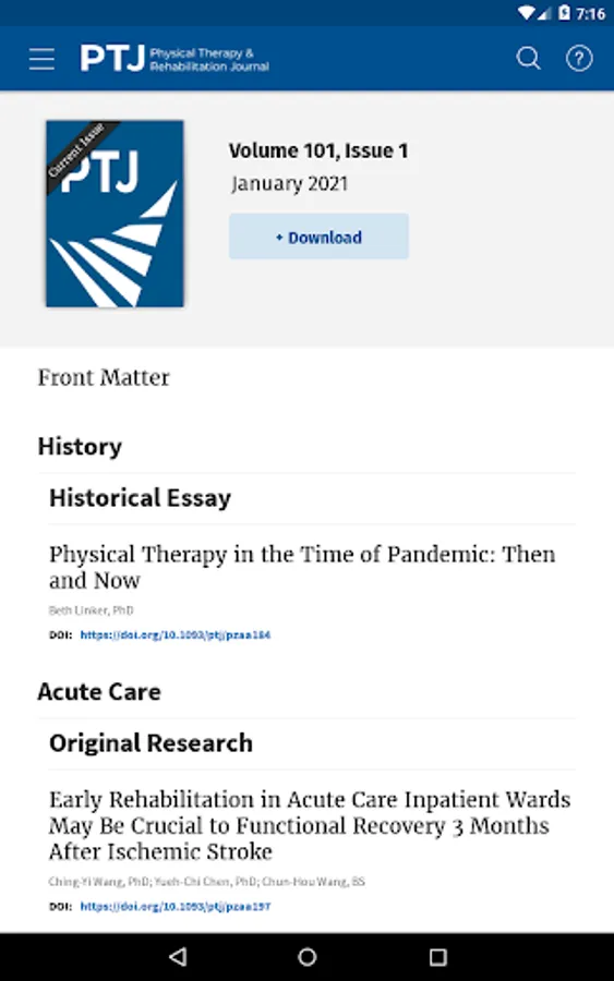 The Physical Therapy (PTJ) journal app from Oxford University Press enables you to read PTJ, the leading international journal for research in physical therapy and related fields, both online and offline on your Android device (provided you have a relevant personal subscription, institutional subscription, or society membership). You can: