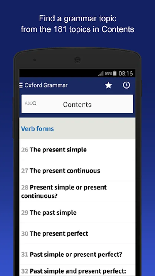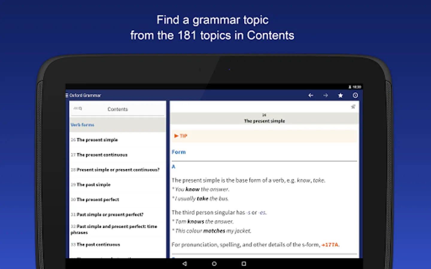 • 181 grammar topics (including full coverage of verbs and tenses, such as present perfect and past continuous, prepositions and much more) – complementing the grammar content in coursebooks and grammar books.