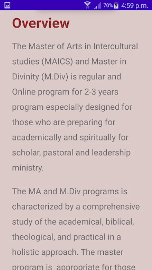 Master of Arts in Inter-cultural Studies (MA): MA is to produce academic Christian scholars focusing by focusing on mission (36 Credits).