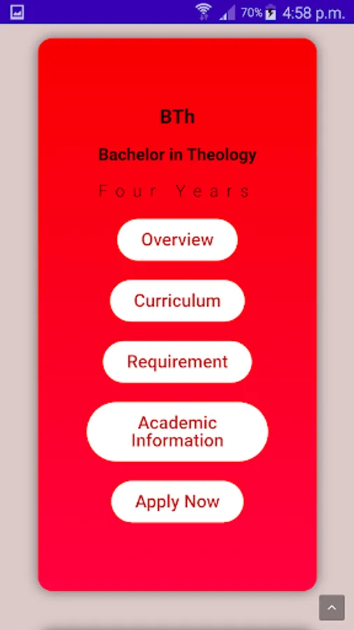 Certificate in Theology (CTh): CTh is to prepare at least theologically educated believers in the Church (16-20 Subjects).