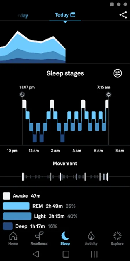See your sleep stages — REM, deep, light — and discover your ideal bedtime.