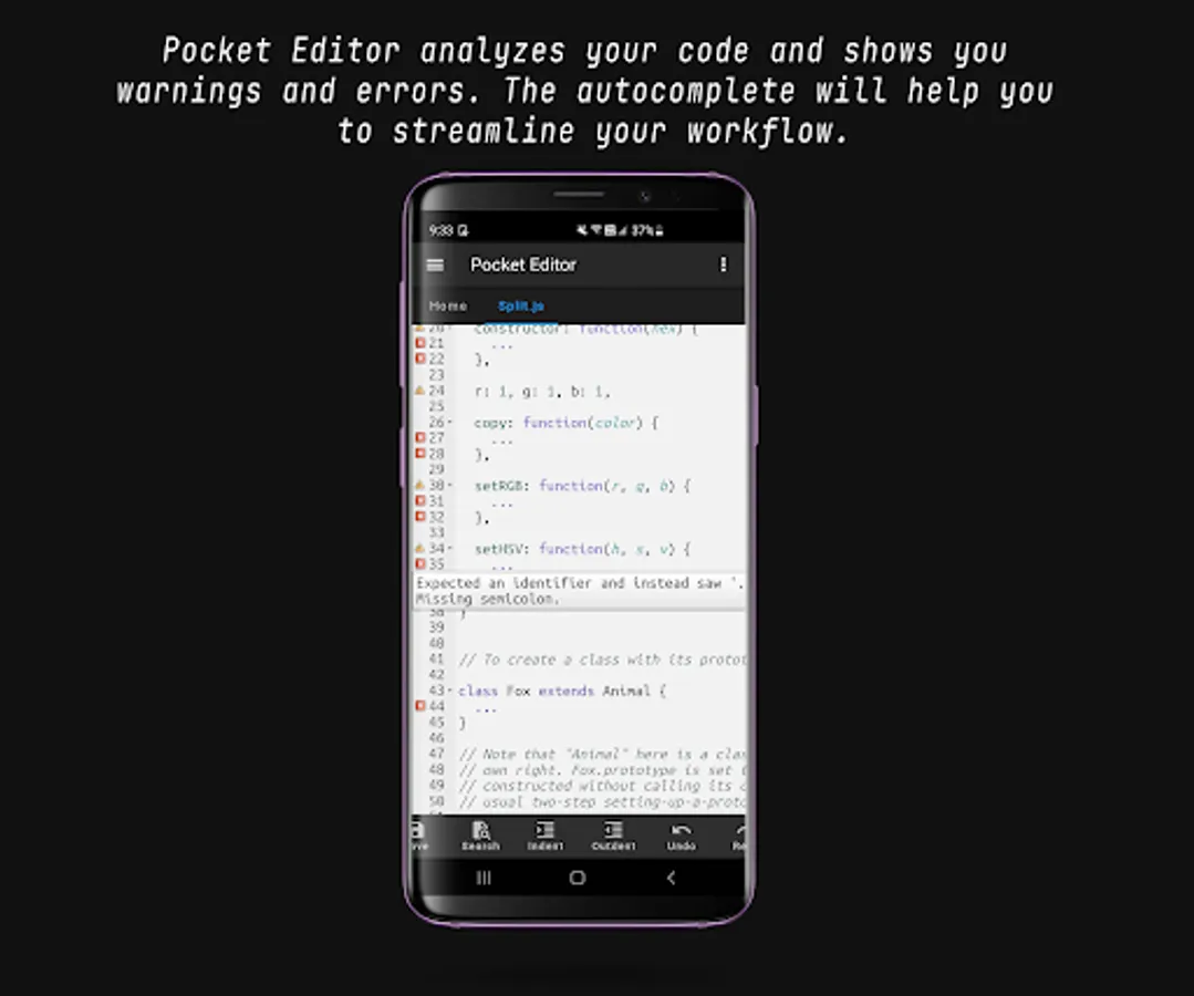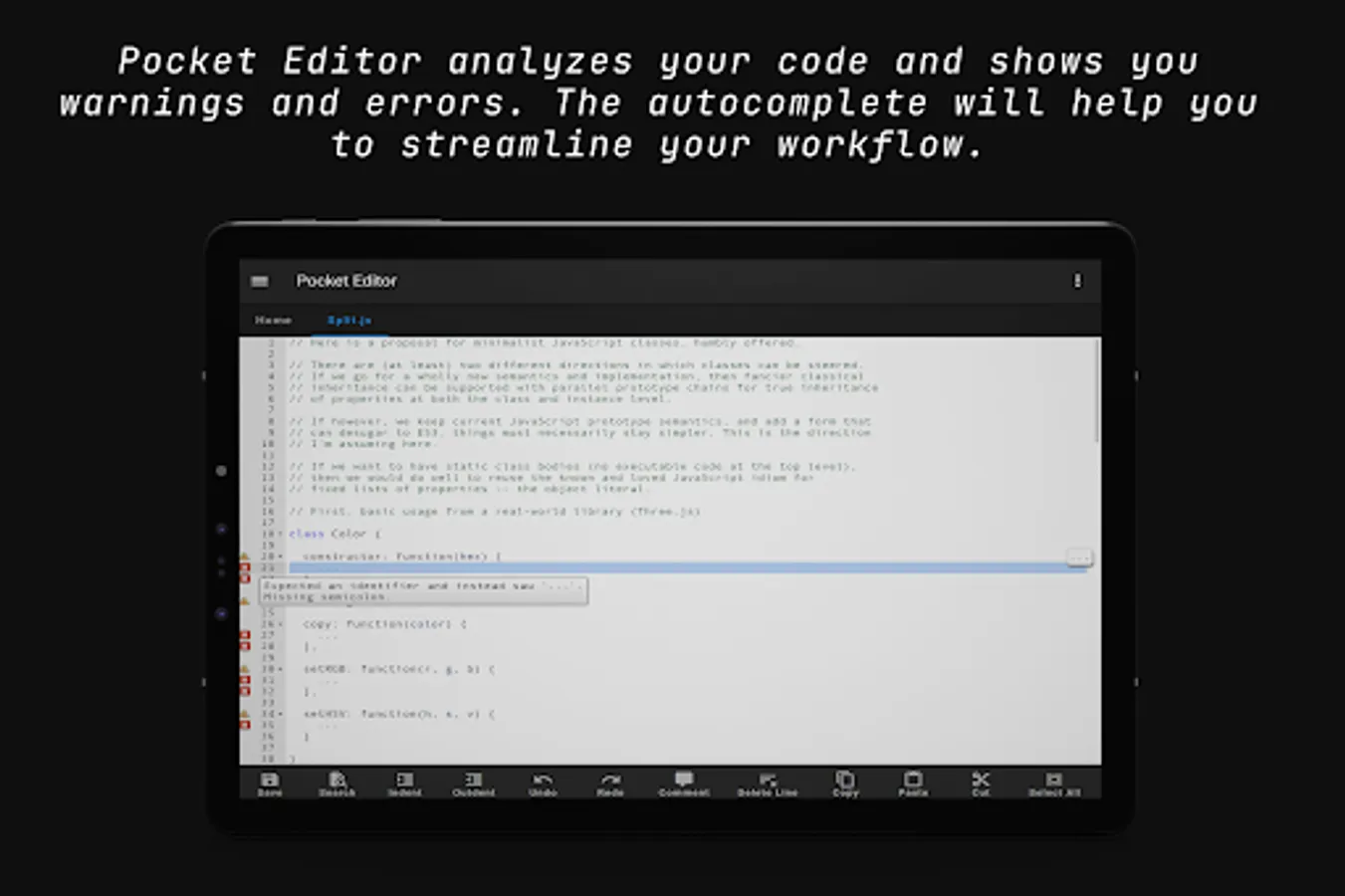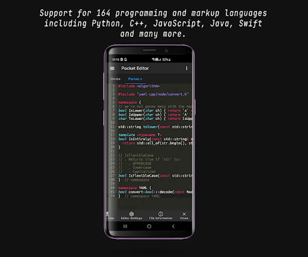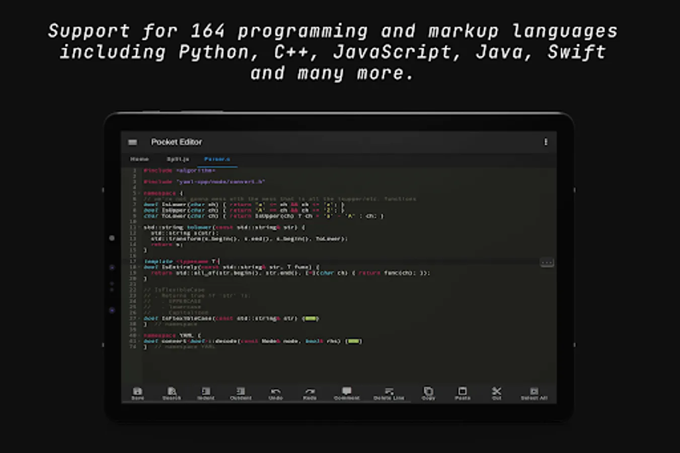Pocket Editor is meant to be used as an integrated development environment (IDE), text editor, and code editor for Android.